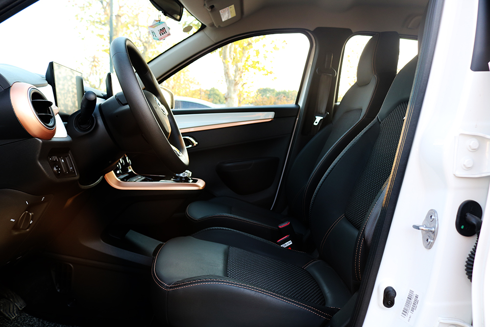 纳米BOX的座椅采用了一体式运动造型,仿皮/织物的材质视觉观感上还是颇有运动质感。此外,座椅填充物比较厚实,包裹性也算良好。