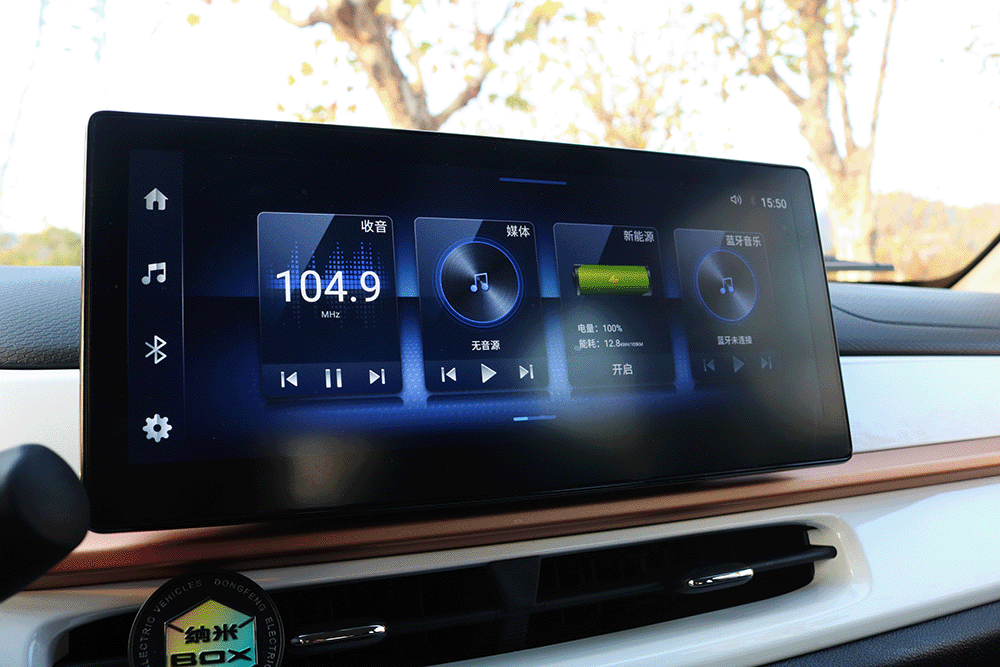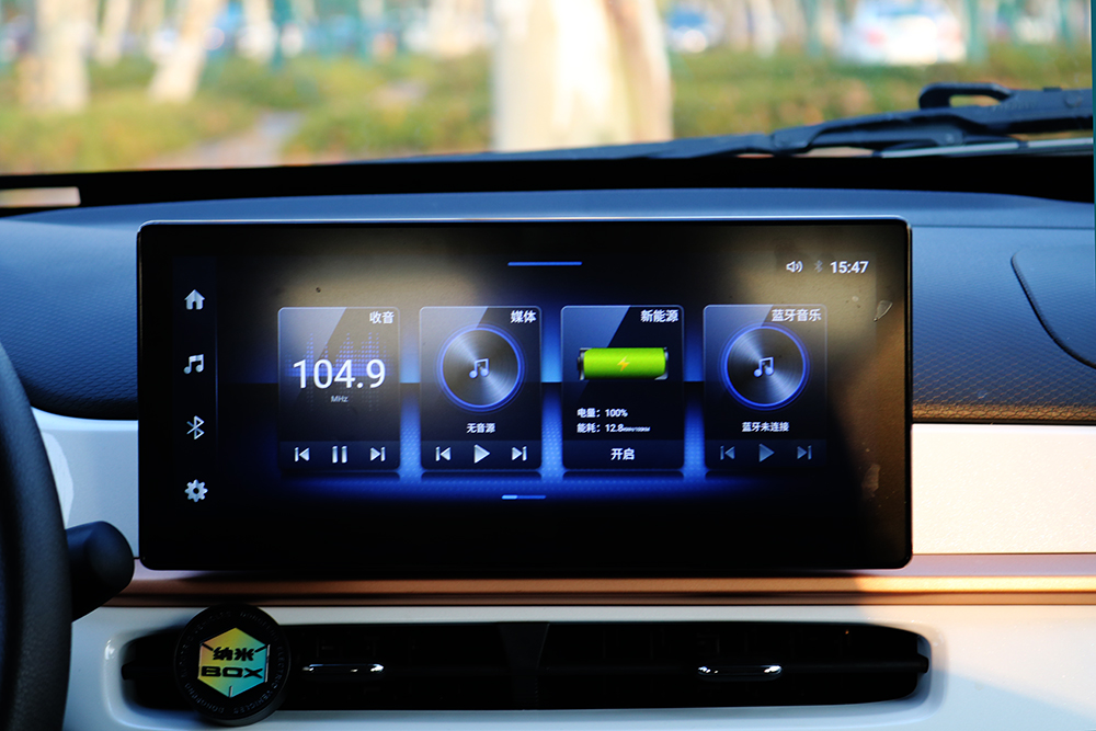纳米BOX的中控屏采用的是10寸的悬浮式设计,中控界面偏于简洁的设计风格,UI界面时尚简约,运行还算流畅。内置了多媒体、语音识别、蓝牙电话和倒车影像等常规功能。