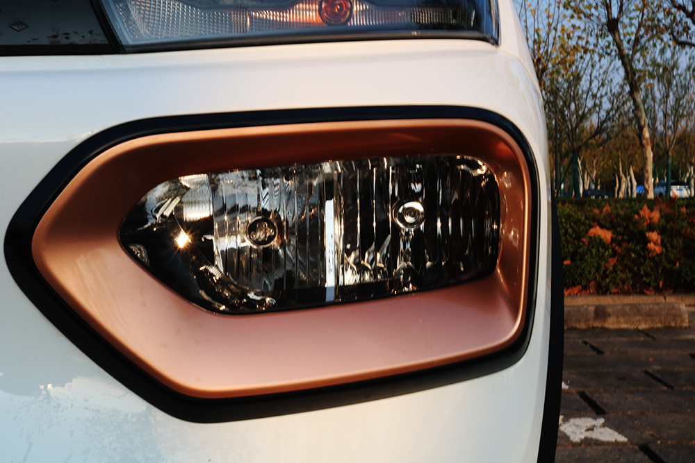 纳米BOX的前大灯组采用了不规则的分体式造型,上方的日间行车灯通过镀铬饰条连接,
