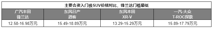 入手门槛低是锋兰达的一大特征。开动车辆以前,我们先聊聊价格,锋兰达厂家指导价为12.58-16.98万元,同为合资入门SUV的XR-V起售价比锋兰达起售价贵了7100元,逍客起售价比锋兰达贵了2.91万元,探歌价格门槛更是比锋兰达高了3.31万元。大家都是合资大厂出品,锋兰达的价格门槛却是最低,而且不光价格低,越级配置还十分丰富。