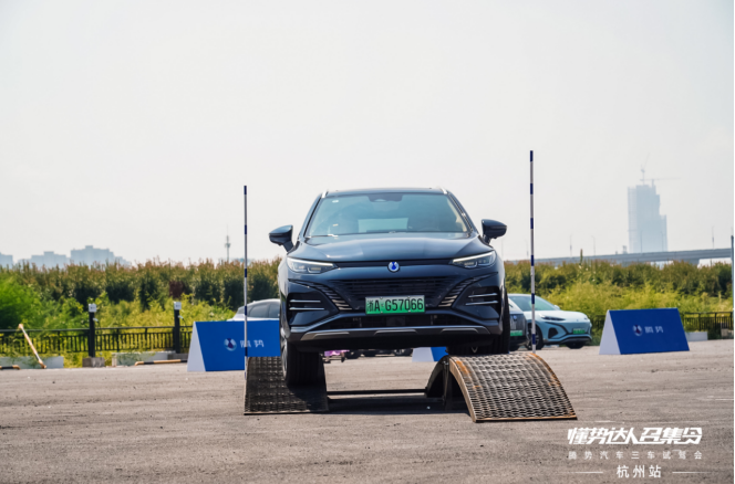 专业赛车手驾驶腾势N8快速通过交叉轴、四轮滚轴、大驼峰、枕木路、凹凸路等挑战科目,为现场嘉宾带来了一场精彩刺激的车技表演,强悍的性能实力让嘉宾们惊呼,瞬间点燃现场嘉宾试驾热情。