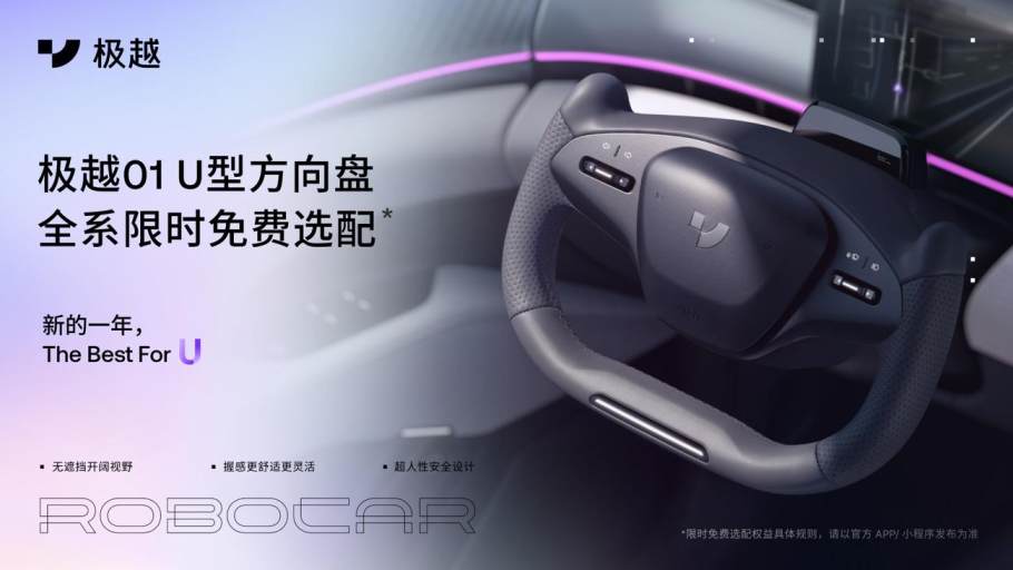 12月28日,极越独特的U型方向盘也同步正式上线。相比于传统的圆形方向盘,U型方向盘的半幅设计将完美适配35.6英寸3D无界一体化大屏,以无遮挡的开阔视野提升信息可见性和智能座舱沉浸式体验。极越01具备业界领先的“纯视觉”高阶智驾能力,大幅减轻了用户的驾驶任务,“高阶智驾+3D无界一体化大屏+U型方向盘”的配置组合,将让用户的出行变得更加轻松惬意。与此同时,极越也更新了U型方向盘选配权益,满足所有用户的个性化需求。