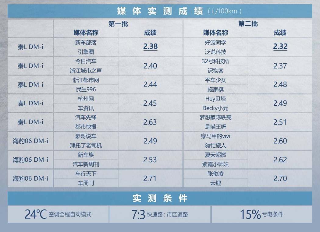 本次解析会同时举行了秦L DM-i和海豹06 DM-i百公里亏电油耗实测。日常通勤怎么开就怎么测,城市快速路占比70%,市区道路占比30%,全程空调自动开启24℃,SOC亏电条件不低于15%,最终杭州站油耗实测成绩全部低于2.8L,再次印证了第五代DM技术的真实力,从省油、技术、设计、空间、驾乘、智能、安全各个维度,引领行业,开创油耗2时代!