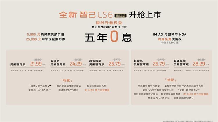 满配再升舱,已是同级最强智能SUV。发布会上,智己汽车诚意加码,还公布了极具吸引力的用户权益。3月31日前锁单,可享5,000元预付款兑换价值25,000元购车现金抵扣券,即直享21.99万~28.29万元限时权益价;及价值36,800元的IM AD无图城市NOA终身免费使用;同时,还有“5年0息大额贷”金融方案,购车零压力。