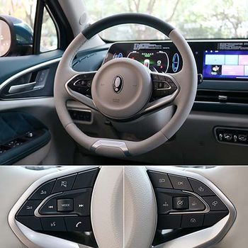 方向盘采用了双辐式设计,且在方向盘多功能按键旁和底部加入了银色装饰,增强了质感。左右两侧的多功能按键内容也很齐全,左侧为360全景影像、语音唤醒、音量和歌曲切换。右侧则是行车电脑和智能驾驶辅助等功能。