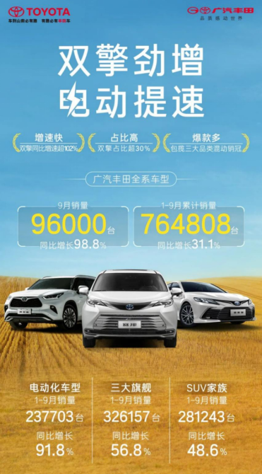 在车辆购置税减半、区域激励政策延续等促汽车消费政策实施一段时间后,车市提振效果明显。在国家商务部9月再次提及支持新能源汽车购买等因素推动下,不仅车市持续向好,广汽丰田双擎也凭借国内混动普及者的先锋地位,成为消费者更信赖的电动化车型优选,三季度双擎也迎来大丰收。