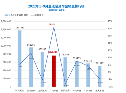 日前,乘联会正式公布9月销量,广汽丰田持续稳中向好。在经历了前两个季度疫情反复、芯片短缺,第三季度高温天气部分地区限电等难题,整体经济和汽车市场均面临较大的挑战。在此背景下,广汽丰田凭借电动化和高端化双核发力,在第三季度交出了令人满意的成绩单,稳居合资头部阵营。9月批发销量96000台,同比增长98.8%;1-9月累计批发销量764808台,同比增长31.1%,销量增速领跑主流合资车企。广汽丰田前三季度的强劲表现,将助力第四季度向“年产销百万台”的目标发起最后冲刺。