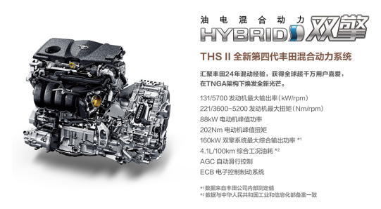 其搭载“TNGA双擎混动”动力科技,采用全新开发的第四代THS Ⅱ混合动力系统,匹配2.5L Dynamic Force Engine发动机,热效率高达41%,百公里综合工况油耗仅为4.1L,仅一箱油可开约1000公里。