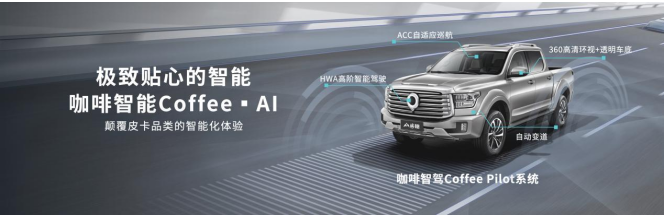 尤为值得一提的是,山海炮还以时下先进的智能科技赋予皮卡更智能、更人性化的体验,配备咖啡智能Coffee▪AI,可实现人车“无障碍交流”;全系搭载ACC自适应巡航、360高清环视+透明车底,可选咖啡智驾Coffee Pilot 系统,实现HWA高阶智能驾驶,高速自动变道,充分满足用户智能出行。