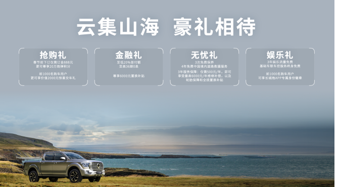 为户外而生,为极致而来!12月30日,长城炮旗下中国首款大型高性能豪华皮卡山海炮,在广州车展重磅上市,汽油3.0T V6车型官方指导价为25.88万-30.18万元;柴油2.4T车型官方指导价为22.88万-24.88万元。同时,长城炮还为山海炮推出“ 抢购礼、金融礼、无忧礼、娱乐礼”四大购车礼,让用户尊享购车体验;并宣布全球百位山海文化官共创活动正式启动。