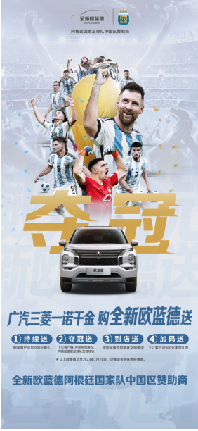 如今,全新欧蓝德已在全国各地陆续交付。作为阿根廷国家足球队中国区赞助商,广汽三菱全新欧蓝德为祝贺阿根廷夺冠还推出了购车加码福利,有意向的车友千万不要错过!车友们只需在春节前(2023年1月21日)成交提车,即可享受以下四重权益(具体权益详情请咨询各地经销商):