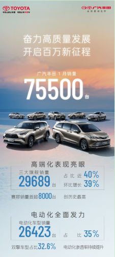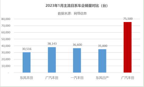 因春节假期销售周期缩短、购置税政策到期等多重因素叠加,1月车市集体遇冷,日系、合资阵营整体呈下滑态势,新势力疯狂内卷价格战。作为主流合资车企,广汽丰田继2022年产销双超100万后,1月强势开局,累销75500台,均超日系车企一倍,稳居日系第一。