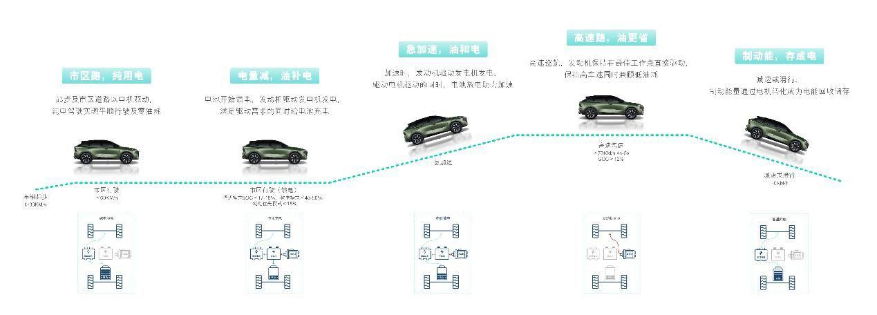 在市区路段,优先用电,保证车辆性能,降低能耗成本;处于馈电时,发动机通过发电机发电驱动车轮,同时为电池补电。猛踩油门时,发动机发电,电池放电,共同让提速响应更快;高速行驶时,切换到发动机直驱模式,发挥高速低油耗优势;制动时,启动动能回收机制为电池蓄电。