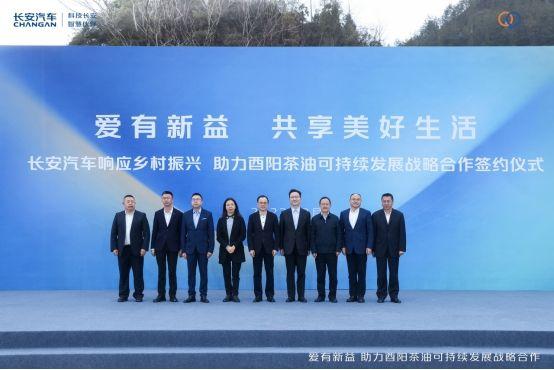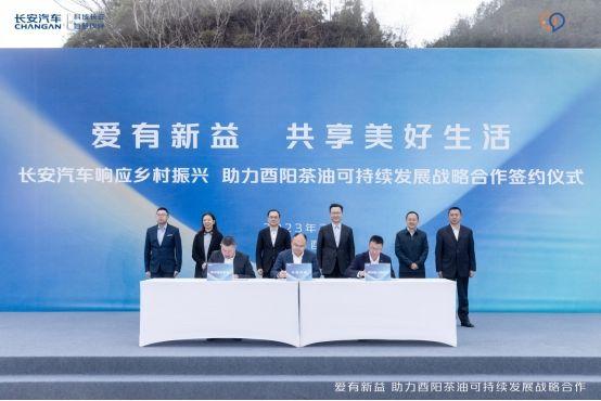 一片油茶树,铺就振兴路。2023年3月28日,重庆市酉阳县桃花源举行了以“爱有新益,共享美好生活”为主题的长安汽车响应乡村振兴助力酉阳茶油可持续发展战略合作签约仪式。在江北区委区政府、重庆乡村振兴局、酉阳县委县政府、长安汽车领导及各界嘉宾的共同见证下,长安汽车、酉阳县人民政府、酉州油茶科技有限公司现场签署了《可持续发展帮扶协议》。
