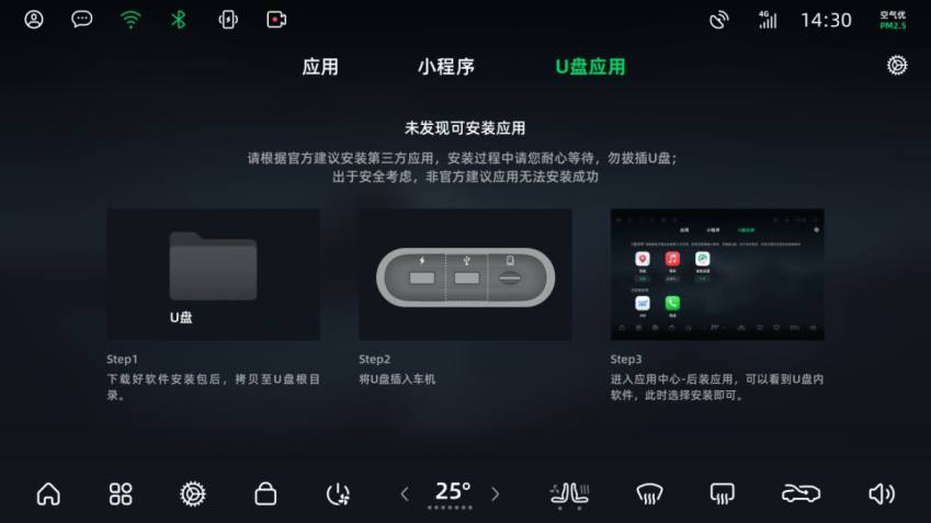新增支持U盘安装第三方应用,通过更开放的车机生态,让用户拥有更为丰富的软件应用选择。