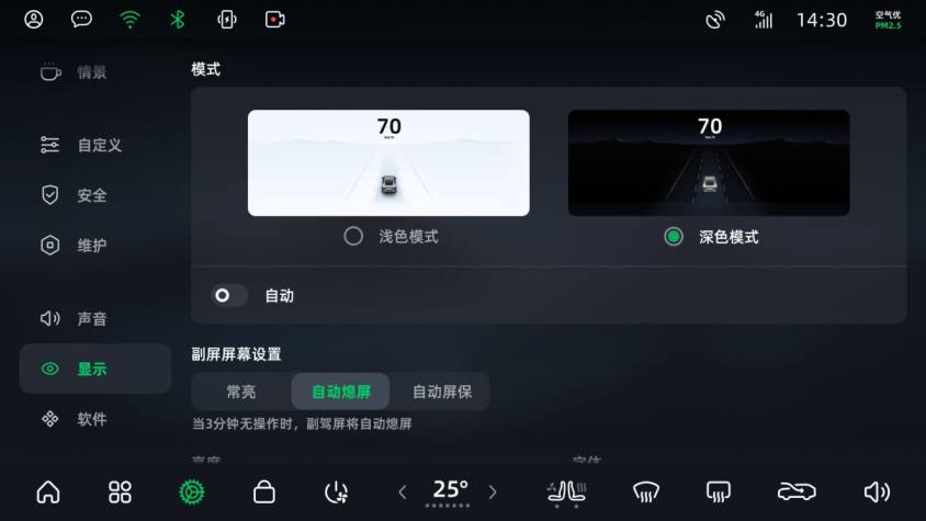 新增副屏自动熄屏选择,3分钟副驾屏无操作自动进入熄屏,缓解副驾乘客在旅程中的视觉疲劳,更节省车机耗电。