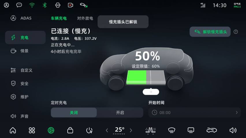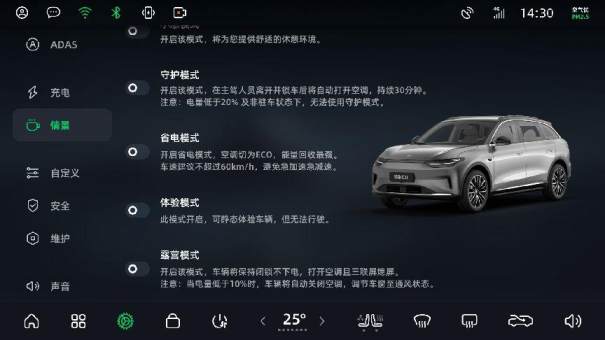 本次OTA在多种场景模式中新增了露营模式,包括车内空调保持打开状态,确保用户长时间在车内休息的适宜温度与空气流通。同时,即使是锁车状态车辆也可持续对外放电,满足户外的用电需求。