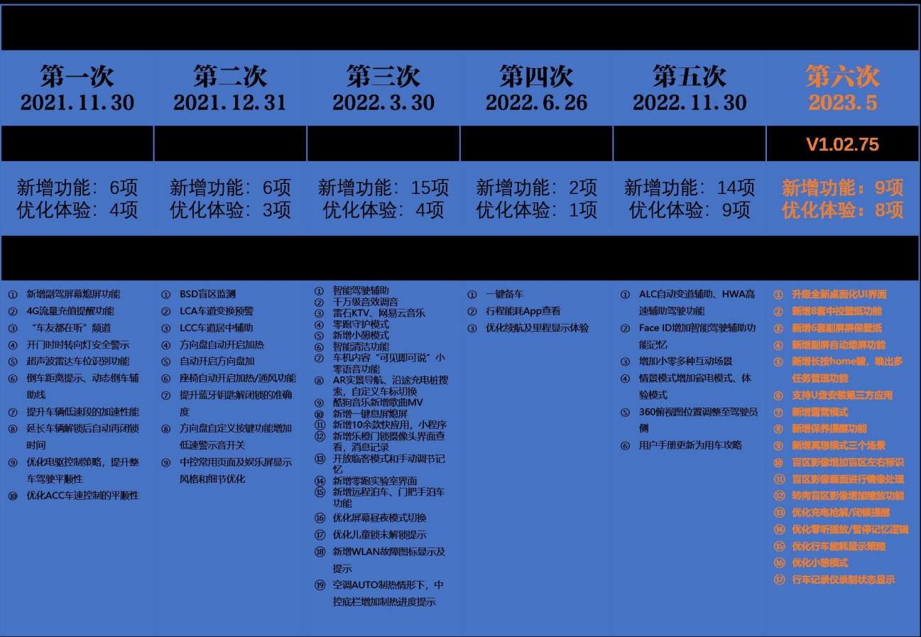 另外,基于用户实际用车需求和反馈建议,本次OTA更新还优化了行车记录仪的录制状态、行车能耗显示、充电枪解/闭锁提醒、盲区影像增加左右标识及画面镜像处理、转向盲区影像增加缩放功能等8项功能。