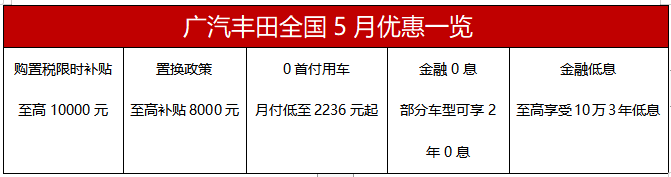 在活动期间,消费者购车即可享最高10000元的购置税补贴以及至高8000元的置换补贴(*更多具体优惠政策及详情,敬请咨询广汽丰田当地经销商),并且还可享2年金融0息、至高10万元3年金融低息、月付2236元起0首付用车在内的三大金融政策。此次优惠车型范围广,包括明星车型凯美瑞、威兰达、雷凌、威飒和锋兰达,以及前4款车型的智能电混双擎版都在优惠清单中。
