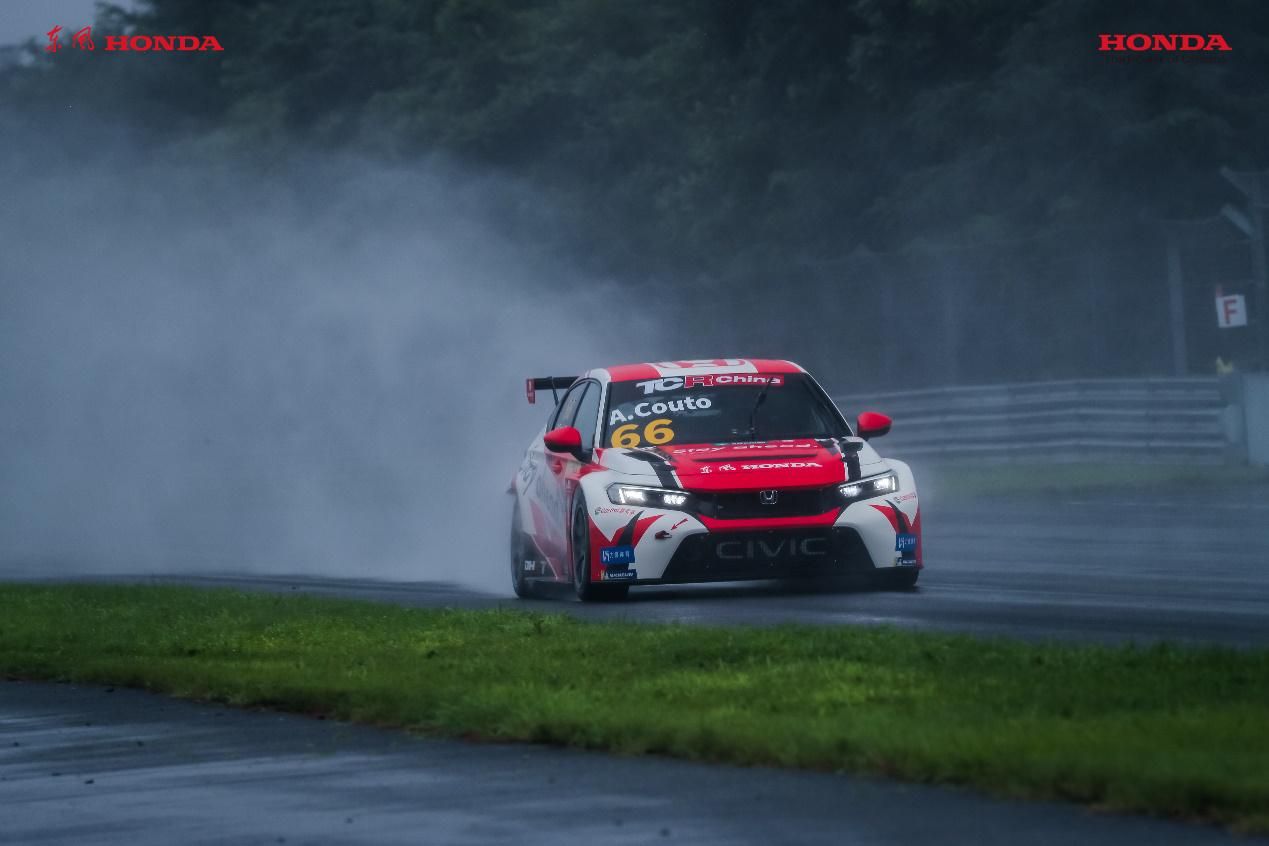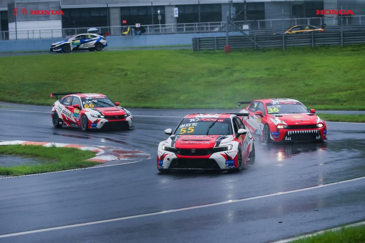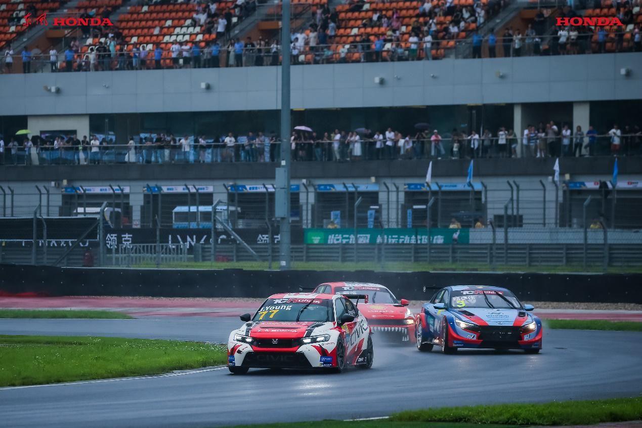 来到下午的第二回合比赛,东风本田车队的高度、谢欣哲、Jack Young分别在第7、第8及第10位发车。本场比赛第一个高潮出现在第三圈,77号车手Jack 驾驶全新一代CIVIC TYPE R上演雨战秘技,连续几个躲闪超车,来到了全场第五的位置。而第二个沸点同样来自这台77号CIVIC TYPE R赛车:在比赛剩下不到5分钟的时刻,Jack Young突然发力,躲过前面两支车队的“夹击”,一跃而至第二,引得全场观众欢呼,并刷出本回合赛事的最快单圈时间1:45.423,车手的精彩技巧和新赛车的优秀性能被展现得淋漓尽致。