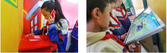 <学生正在演练如何拨打报警电话> <小学生们正在学习安全科普知识>
