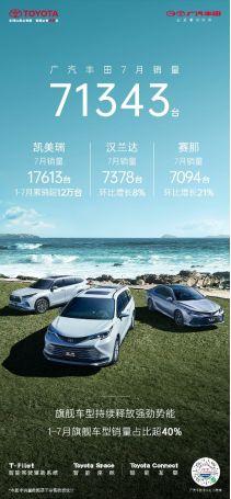 7月作为汽车市场传统淡季,整体车市需求减弱,厂商及经销商均放缓产销节奏。与此同时,国家在下半月出台促汽车消费“十条”措施地方政府新增第二轮购车补贴政策,积极提振车市消费。面对跌宕起伏的市场环境,广汽丰田在重压之下保持战略定力,7月实现终端销量71343台,1-7月累计销售501005台,稳居主流合资前三、日系第一,创下了下半年的良好开局。