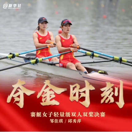 在赛艇女子轻量级双人双桨决赛中,中国选手邹佳琪和邱秀萍以7分06秒78的成绩夺得冠军,摘得杭州亚运会首块金牌,赢得开门红!这也是中国队连续六届夺得亚运会首金。