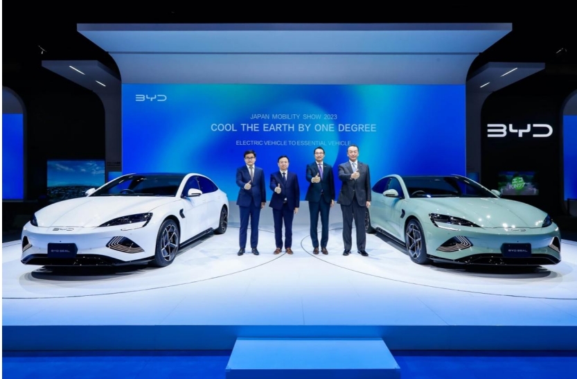 D9,吸引了众多参展者驻足参观与体验。 比亚迪海豹亮相 仰望U8和腾势D9亮相 比亚迪亚太汽车销售事业部总经理刘学亮表示:“28年来,比亚迪始终坚持以科技创新为动力,以绿色梦想为初心,不断努力实现生活方式的多样性和自然环境的和谐统一。在日本消费者的支持下,我们将致力于电动车技术和产品的推广,助力电动车成为民众必不可少的绿色出行选择。” BYD AUTO JAPAN株式会社总经理东福寺厚树介绍了几款重磅车型,并表示:“比亚迪携多款车型亮相东京车展,并带来领先的电动车技术,积极赋能日本电动化转型。” 左二:比亚迪集团董事长兼总裁王传福;右二:比亚迪亚太汽车销售事业部总经理刘学亮;左一:比亚迪品牌及公关处总经理李云飞;右一:BYD AUTO JAPAN株式会社总经理东福寺厚树 当天,日本“漂移王”、《头文字D》主角藤原拓海原型、勒芒24小时耐力赛亚军车手土屋圭市也受邀莅临展台,与现场观众互动。 2022年7月,比亚迪正式进入日本乘用车市场,目前已在日本全国开设了15家门店,覆盖了东京、大阪、横滨、名古屋、福冈等多个城市,通过打造个性化、便捷的消费体验,拉近与消费者的距离。比亚迪计划于2025年年底前,携手当地优质经销商和合作伙伴,在日本开设100家门店,以满足当地消费者对新能源汽车的更多需求。 截至2023年9月,比亚迪新能源汽车累计销量已超过540万辆,新能源足迹覆盖全球六大洲的70多个国家和地区,超400个城市,全球化战略稳步推进。未来,比亚迪将继续用技术创新,满足人们对美好生活的向往,通过更安全、更智能、更高效的新能源产品和技术,为日本及全球消费者提供独特的出行体验,为全球可持续发展贡献力量,彰显中国品牌硬实力。