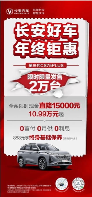 11月24日-11月30日,凡购买长安第三代CS75 PLUS车型,即可享受0首付 0月供 0利息和888元享终身免费基础保养优惠政策,限时限量发售2万台。