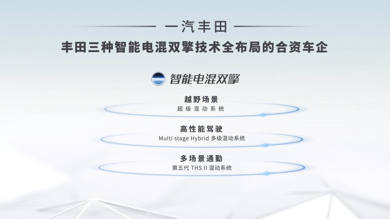 技术是车企突破重围的最好途径,一汽丰田十分重视技术创新的作用,不断推进技术快速落地,以“好用、实用、爱用”的智能化产品,让所有用户享受智能平权、安全平权。2023年,一汽丰田发布了全新技术主张——IT'S TIME此刻,智未来。全新智能化“4T”技术包含:全新智能电混双擎、T-Pilot智能驾驶辅助系统、Toyota Connect智能互联、Toyota Space智能座舱。