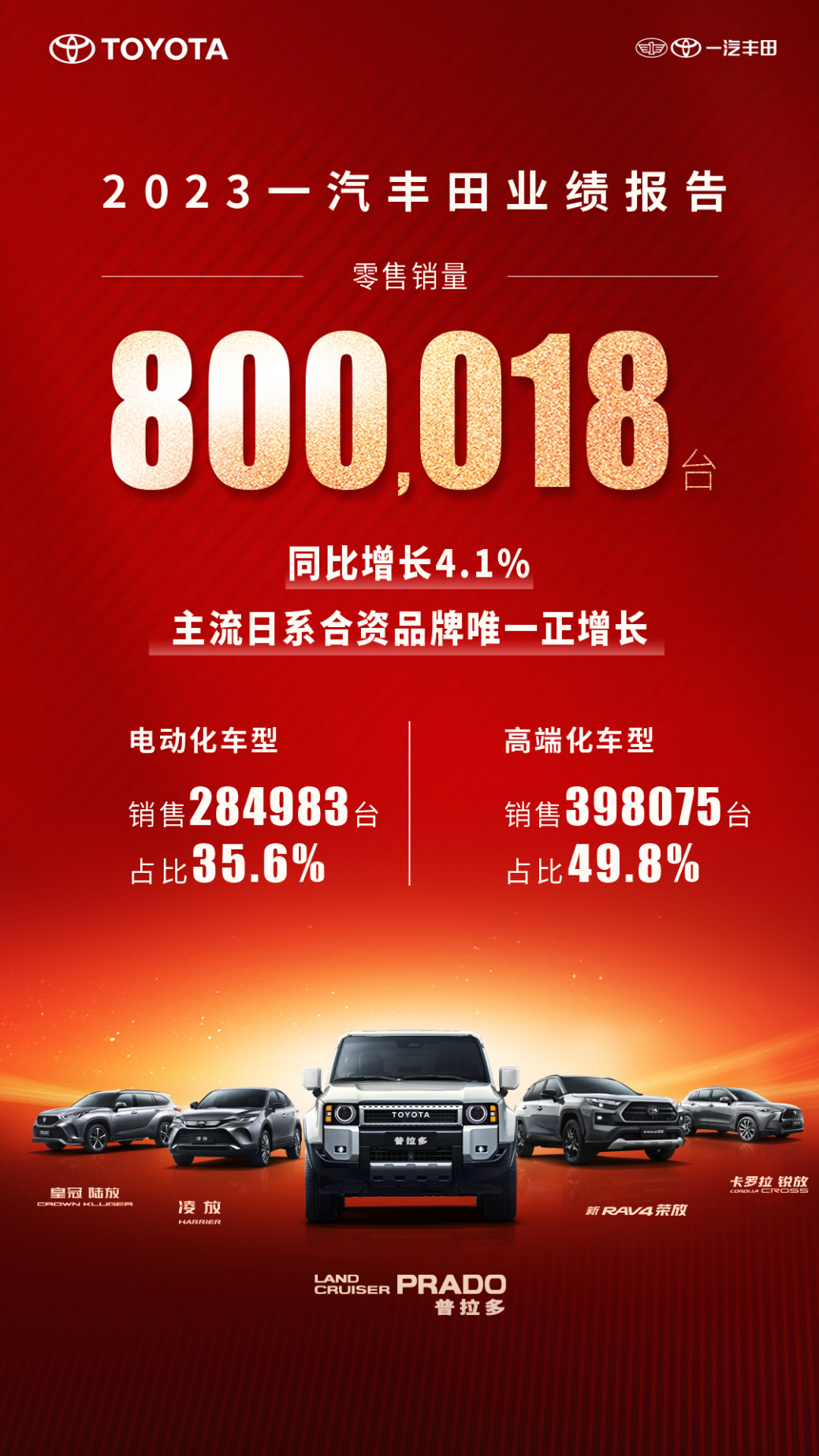 2023年的中国车市,内卷是主题,竞争是常态。不仅因为增量市场的消耗殆尽,还有新能源汽车崛起而导致的车市格局变化。此外,价格战等恶性事件也让整个行情变得更加困难。市场格局的重构,用户需求的提升,让许多车企毫无招架之力,即便在这样的环境下,作为主流合资车企,一汽丰田却以一份优秀的成绩单收官2023年。