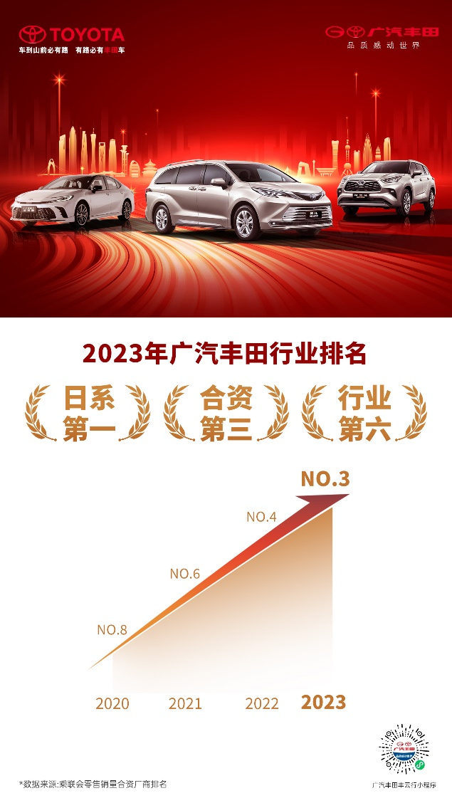 2023年广汽丰田全年零售销量901025台,位居日系第一、合资第三、行业第六。 广汽丰田的市场排名自2020 年以来一路进阶,逐年攀升,在合资阵营中的排名从2022年第四上升至第三,超越上汽通用,首次挺进合资前三甲。全行业排名从第七上升至第六,成为唯一跻身行业前六的日系品牌,并创下日系合资近五年来最好排名。
