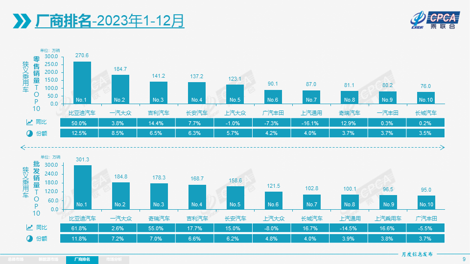 而在乘用车零售销量前十中,比亚迪、吉利、长安、奇瑞、长城等中国品牌占据五个席位,在批发销量前十中,自主品牌更是妥妥的火力压制,不仅占据六个席位,几个硕果仅存的合资车企都只能靠边站。