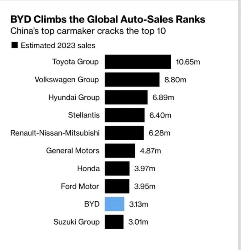 2023年,比亚迪成为首个进入全球汽车销量前十的中国自主品牌,位居第九,并且以302万的销量超过特斯拉,成为全球销量最高的新能源汽车品牌,也是最早开始且唯一完成新能源汽车转型的汽车制造商。越来越多的人开始记住“BYD”。