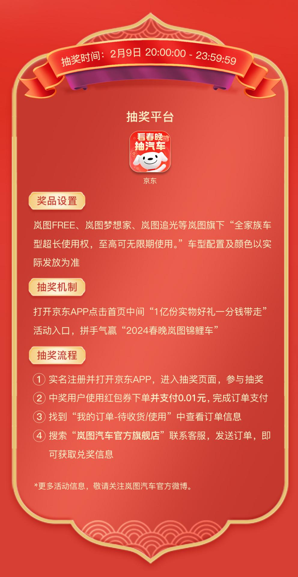 2月9日晚8点开始,除夕看春晚,跟随晚会主持人口播提示,观众朋友们只需登录京东APP,点击首页中间“1亿份实物好礼一分钱带走”活动入口,拼手气赢“2024春晚岚图锦鲤车”,即有机会抽取100辆岚图汽车实物好礼。此外,岚图汽车官方平台会不断发布最新动态,欢迎广大用户及时关注并参与抽奖活动。