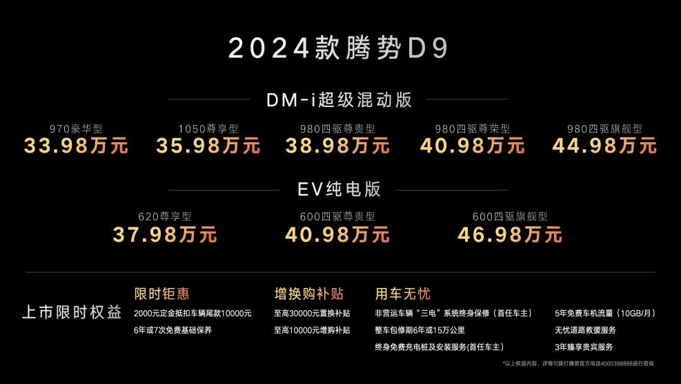 DM-i超级混动版官方指导价33.98万元-44.98万元,新款腾势D9纯电版官方指导价37.98万元-46.98万元。并推出2000元定金抵扣车辆尾款10000元,6年或7次免费基础保养,至高30000元置换补贴,至高10000元增购补贴,限时金融贴息,三年臻享贵宾服务,四大用车保障,五大尊享智联等上市权益。针对老用户也推出了30000元置换补贴,贵宾服务权益转移,10000元增购补贴,2000元延保补贴,4000元量子漆面保护膜补贴等感恩回馈。 作为腾势汽车破局豪华MPV全品类冠军的扛鼎之作,腾势D9强势打破传统MPV车型20余年统治,彻底改写MPV市场格局。作为全球领先的新能源豪华汽车品牌,腾势汽车敢于自我超越、不断进化,2024款腾势D9将从“设计、乘坐、驾驭、智能、电动、安全”六大豪华实现王者进化。 设计豪华的王者进化 基于安全、感官、美学、实用性等多维度考量,2024款腾势D9采用了π-Motion势能美学的主流设计,并根据流行趋势和用户需求,于帕米尔高原上的璀璨星河汲取灵感,新增璀璨紫外观配色,阳光折射下,漆面熠熠生辉,豪华且优雅。 豪华内饰方面,2024款腾势D9新增云峰棕与旷达米、鎏年棕的双色组合,不仅提升了座舱高级感,也为商务和家庭用户提供了更多选择。同时,新车内饰豪华质感臻于至善,空调出风口增加亮饰条,四门及后尾门增加金属踏板,豪华细节的修饰恰到好处。 乘坐豪华的王者进化 让全家人坐着都舒服,才是真正的乘坐豪华。2024款腾势D9以“2+2+3”布局构建出超大无差别7座驾乘空间,二排座椅采用1080mm超长电动滑轨,坐垫长53cm、宽56cm、高38cm,一体式腿托可上调110度,入座即享最佳人体工程学状态,豪华舒适性媲美飞机头等舱,全面碾压公路高铁,三排空间远超主流豪华5座SUV第二排,座椅支持前后移动,带来更加灵活的后备箱空间。在坐满7个人的情况下,2024款腾势D9后备箱仍可装下7个20寸行李箱及7个双肩背包,轻松满足家庭、商务装载需求。 舒适配置方面,2024款腾势D9新增7.5L智能冷暖冰箱、前排电吸门、中排小桌板、中排座椅物理按键等多项全系标配配置。其中,冰箱支持-6℃~50℃制冷制热可调,更具有电动伸缩、12小时延迟断电等丰富功能。驾驶配置方面,2024款腾势D9全面升级真皮方向盘,辅以方向盘加热、方向盘实体按键、流媒体内后视镜等实用配置,让驾驶感受再上新台阶。 驾驭豪华的王者进化 宜商宜家的驾驭与舒适,行稳致远,从容演绎潇洒人生。2024款腾势D9依托于全球领先的新能源技术,提供DM-i超级混动、EV纯电动双动力选择,满足全场景出行需求,长途行驶再无里程焦虑。 智能底盘方面,2024款腾势D9搭载云辇-C智能阻尼车身控制系统,在不同路况自动匹配不同阻尼,舒适、运动双模式可选,较强、适中、偏弱三挡可调,无感通过减速带、凹凸路面,显著抑制转弯侧倾,兼顾舒适性与操控性。同级领先的CCT舒适控制技术经优化升级,制动俯仰提升20%,转弯侧倾控制提升12%,轻松应对各种路况,全车人不晕车,时刻坐享舒适。 智能豪华的王者进化 2024款腾势D9基于智能座舱、智能驾驶、智能底盘打造D9全维智能豪华。腾势Link