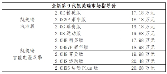 (2024年3月6日)全球旗舰,智电新生。广汽丰田全新第9代凯美瑞今日正式上市,率先推出2.0L智能电混双擎和2.0L汽油版两大系列,市场指导价为17.18万至20.68万元,后续将公布2.5L智能电混双擎系列价格。2.0L智能电混双擎17.98万元起,合资B级混动轿车首次进入17万元区间,2.0L混动顶配仅为20.68万元,价值升维,价格降维,混比电香!奏响智能电动化时代强音。 只有足够强,才能足够卷。有定价权的才是真旗舰!广汽丰田积极拥抱市场变化,全情回报用户,持续释放头部品牌诚意,掀起“价值红利”普惠风暴。全新第9代凯美瑞以高标价值与给力价格再定新坐标,打造“20万级家用轿车最好选择”,让用户率先享有“纯粹质感之上,再创先锋智电”的新一代中高级轿车。 一见钟“擎”,混比电香!奏响电动化升级最强音 自广州车展首发以来,全新第9代凯美瑞展现了“当家旗舰,流量之王”的火热势头,截至3月5日,预售订单已达到9136台,其中智能电混双擎占比80%,混动中高配车型占比70%,带来“更好用、更普适、更超值”的电动化新体验,成为主流人群主流选择。 全新第9代凯美瑞搭载第五代智能电混双擎,采用三元锂离子电池组,重量减轻约44%,电芯输出功率提升15%;PCU电控能量损耗降低9.1%;电机功率提升14%,达到100kW,输出强劲电驱动力。2.0L智能电混双擎系统最大输出功率145kW,动力性能超越2.0T车型,油耗仅为4.2L/100公里,比同级燃油车降低30%,超长续航1000公里以上,全温域、全场景使用无焦虑,彻底释放出行自由度。后续,全新第9代凯美瑞将推出2.5L智能电混双擎系列,系统最大输出功率169kW,加速性能媲美同级插混。 全球车,中国舱!赋智电以品质,让科技更悦人 第9代凯美瑞打造质感上乘的智能座舱。新车搭载8155车机芯片,拥有12GB运行内存,算力提升超