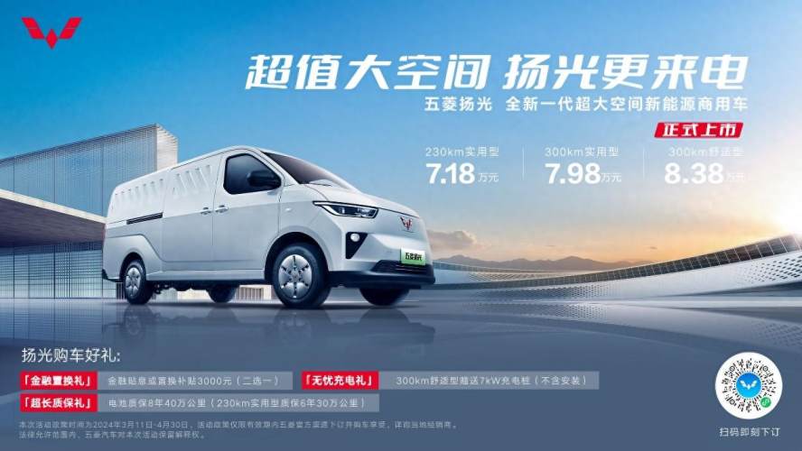 【2024年3月11日】今日,五菱汽车旗下全新一代超大空间新能源商用车五菱扬光正式上市,售价7.18万元-8.38万元。新车共推出230km、300km两种续航版本,共三种配置选择,搭载五菱红1号电池,配备6.5m³超大货厢空间及司机级座舱,以越级配置与惊喜价格,满足用户多重进阶需求,带来超可靠、超能装、超好开的用车体验。