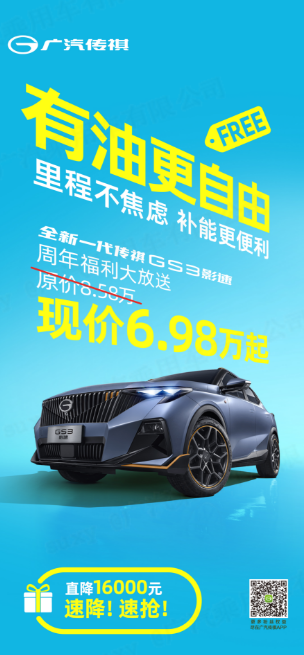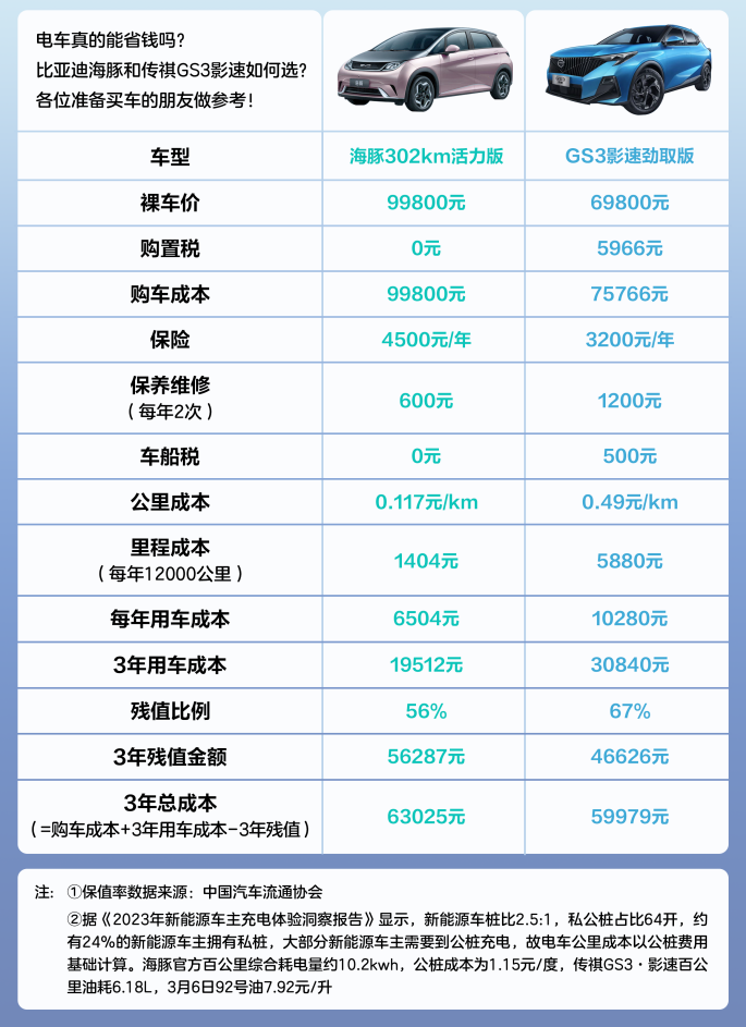 自去年3月8日上市以来,传祺GS3·影速就始终稳居细分市场销量榜单前列,深受年轻人的喜爱。为回馈消费者的厚爱,在上市一周年之际,传祺GS3·影速福利大放送!原来指导价8.58万起,如今仅需6.98万起就能拥有,在如今油电之争愈发激烈的战场上,买传祺GS3·影速,才是真正的把钱花在刀刃上。 油比电省,你怎能错过! 当下很多年轻人选择购买电动车,都是为了省钱,但是电动车真的省钱吗?小编算了一笔账,从购车成本对比,传祺GS3·影速6.98万的售价,就算加上购置税成本,都比比亚迪海豚9.98万低了2.4万元左右。可以说,买传祺GS3·影速,购车门槛大大降低,而且换算下来,还省下了近4-5年的油费(1.2万公里/年计算),简直不要太省。 另外,从上表可以看出,结合购车成本、3年用车成本、3年残值金额,传祺GS3·影速进取版的3年总成本是59979元,对比海豚63025元低了超3000元,够一家人去一趟短途春游了。可以说,传祺GS3·影速就是油比电省的代表。 有油更自由,里程不焦虑 续航里程,应该是很多买电车的消费者绕不开的一个问题。作为电车的比亚迪海豚302km活力版,据官方数据,续航里程为302公里。这也意味着,如果想要和家人出去自驾游,充电时间甚至比游玩时间还长,补能和续航焦虑无法避免。要是遇上冬天出门,续航难免缩减的情况下,空调都不敢开。 传祺GS3·影速搭载第三代1.5T