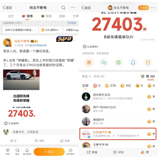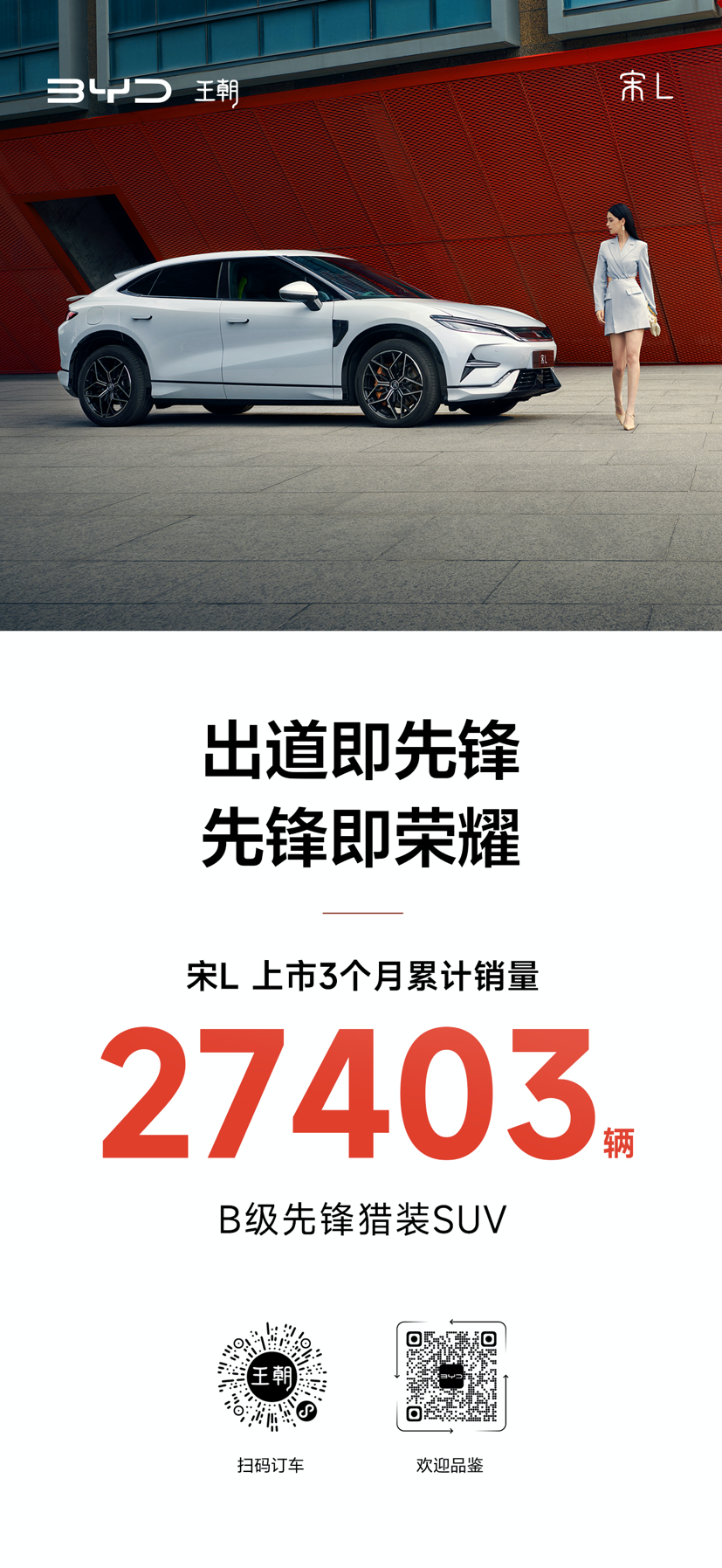 作为比亚迪王朝网面向主流中高端市场的先锋之作,宋L自去年12月15日上市以来,销量一路高歌猛进。近日,比亚迪也大方秀出了宋L的好成绩:上市3个月累计销售27403辆。海报上的“出道即先锋,先锋即荣耀”,让媒体和网友纷纷猜测:宋L是确定不出荣耀版了? 自开年以来,比亚迪王朝系列秦/汉/唐/宋/元,陆续推出荣耀版,凭借“电比油低”的震撼价格和焕新配置,让用户拥有更好的出行体验,加速“油转电”进程。 荣耀版这一大招,也让比亚迪在2024开年成为了整个车市最令人瞩目的车企。今日,有大V发微博爆料“宋L没有荣耀版”,引来了比亚迪汽车微博官号点赞回应,也坐实了这一信息。 有计划购买宋L的网友可以安心下单了。宋L虽然没有荣耀版,但其强势表现可谓“先锋即荣耀”!作为去年末才上市的全新B级先锋猎装SUV,宋L的上市价格比预售价格,最高下调了近4万元。如今回看,宋L才是比亚迪的“荣耀先锋”,也是比亚迪真正的大招。 比亚迪宋L采用了猎装设计风格,颜值高、姿态优雅,并且搭载三大明星技术“e平台3.0、CTB、云辇-C”、三项先锋配置“无框车门、自适应电动尾翼和前窄后宽混合胎”、三大智能系统“DiLink智能座舱、DiPilot智能驾驶辅助和智能进入”,更不用说还有800V高压平台加持。可以说,宋L不仅有颜更有料,入门即满配,物超所值。 宋L给用户带来了更有质感的先锋驾乘体验,引领B级纯电SUV的价值新标准。Model Y一家独大的局面将受到挑战。