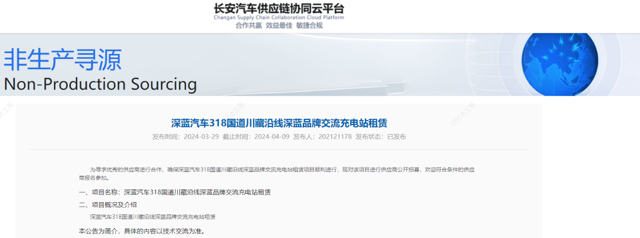 继3月18日深蓝新车G318亮相并发布“318国道生态保护计划”后,仅十天时间,深蓝汽车318国道川藏沿线深蓝品牌交流充电站租赁项目已经在长安汽车供应链协同云平台上公开挂网寻源。