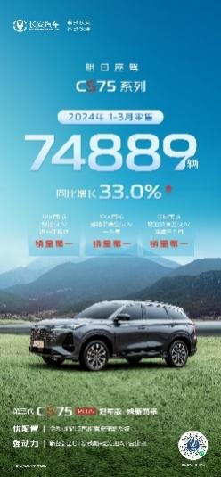 3月,长安CS75PLUS凭借强大产品力,热销15574辆,再次卫冕紧凑级燃油SUV销量冠军。1-3月,长安CS75PLUS累计销量达74889辆,同比增长33%,连续三个月夺得中国市场燃油紧凑型SUV销量冠军,也是中国市场燃油SUV近一年累计销量冠军。