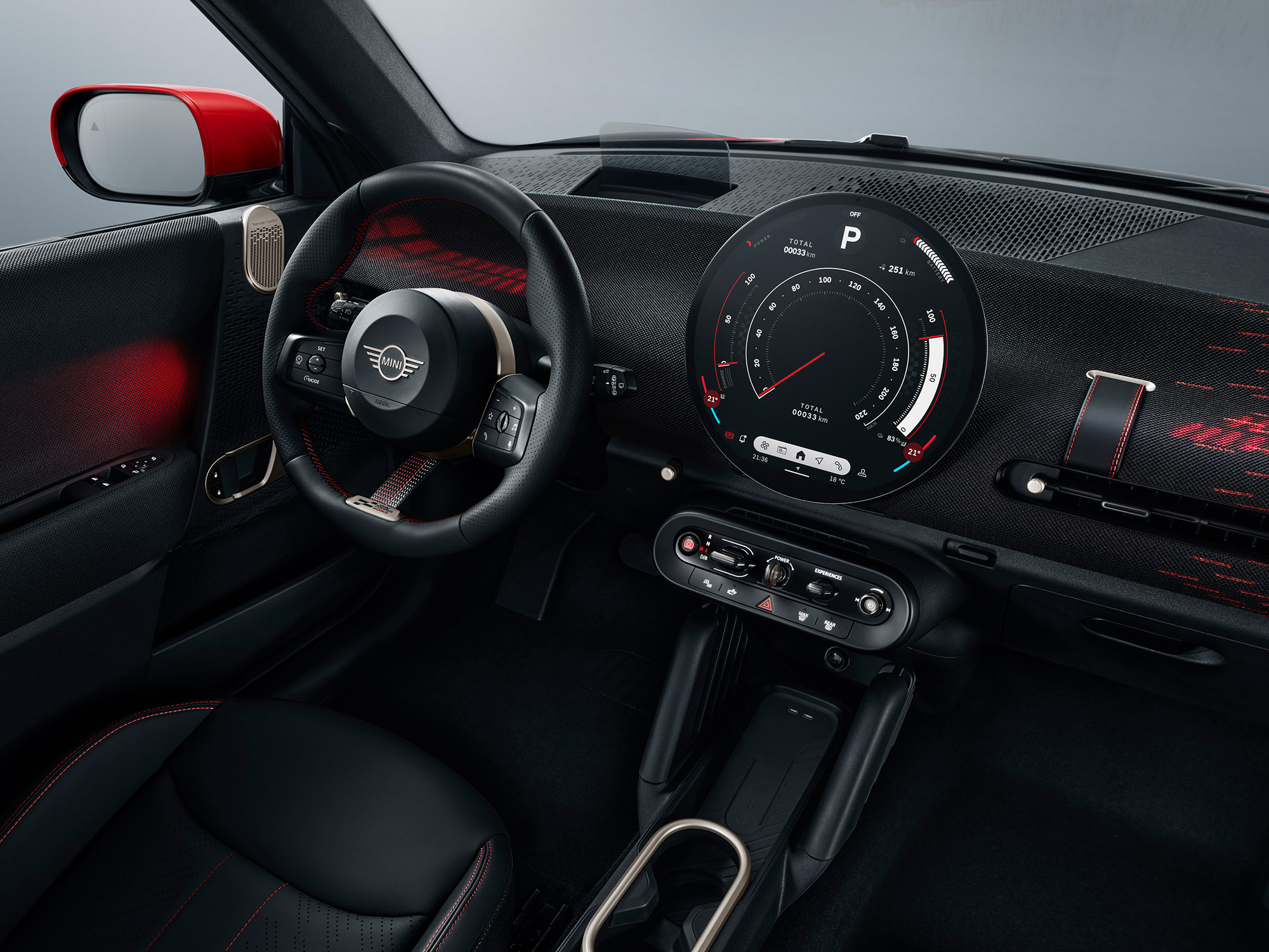 “极简至上”的MINI品牌设计哲学在全新电动MINI Cooper车内得到忠实再现。在当年的经典Mini上,设计师仅保留三个基本元素——方向盘、圆形中央显示屏、拨杆开关,构成了车内最纯粹的设计,大胆,简约。如今,全新电动MINI Cooper的前排区域设计充分致敬这一纯粹风格,以同样仅有的三项基本元素,生动诠释“迷你至简”的特质。