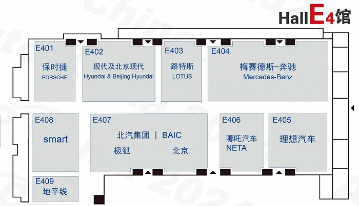 E4馆:奔驰、保时捷、理想、哪吒、北汽、现代等。保时捷以及奔驰带来新一代电动化车型保时捷纯电Macan以及奔驰EQG刚上市3天销量就破万的理想L6都是主要看点。