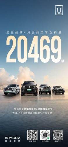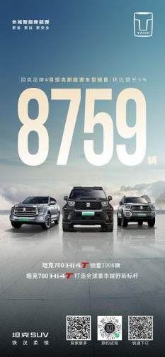 5月6日,坦克品牌发布4月销量数据,坦克品牌全品类销量20469辆,整体销量环比增长8%,同比增长88%,连续40个月蝉联中国越野SUV销量第一,并占据硬派越野市场50%以上的市场份额;坦克品牌新能源4月销量8759辆,其中坦克700 Hi4-T销量达2006辆,树立全球豪华越野新标杆。助推长城汽车保持硬派越野车型销量第一,越野新能源车型销量第一。