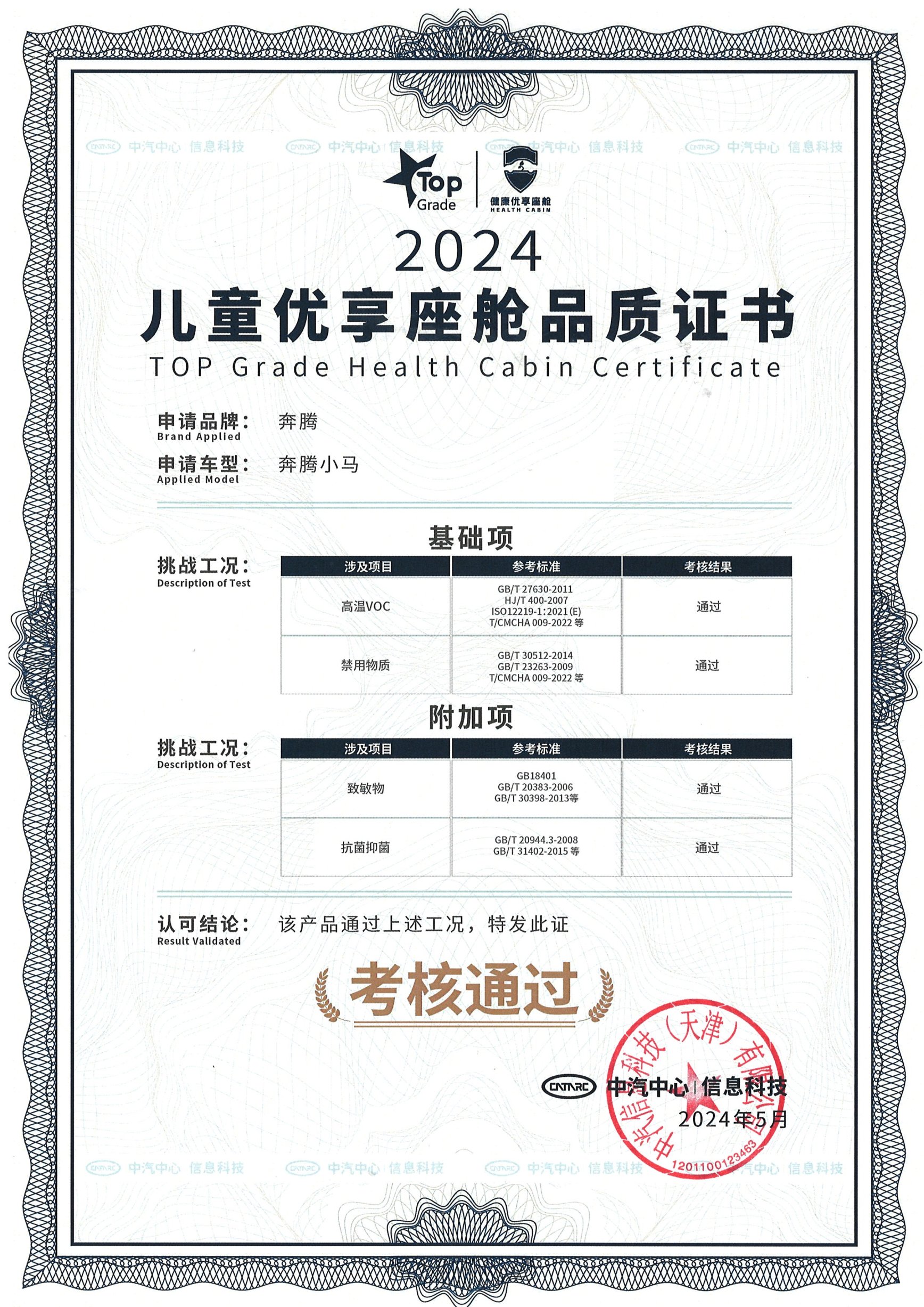 关键时刻靠得住,踏实放心好安全。10个核心刚度环加6处高强钢防撞梁,形成稳固笼式安全车身,小车也有“硬骨头”;100多项严苛测试,铸就“无畏级”安全电池。IP68级高标准防水达到国标要求2倍,涉水不漏电,冲击不起火;奔腾小马还获得了中汽中心颁发的“儿童优享座舱品质证书”,致敏物测试、禁限用物质测试、高温VOC测试、座椅抗菌抑菌测试四大类53项健康座舱测试项目,全部通过中汽中心权威认证测试,且98%远超国家标准。