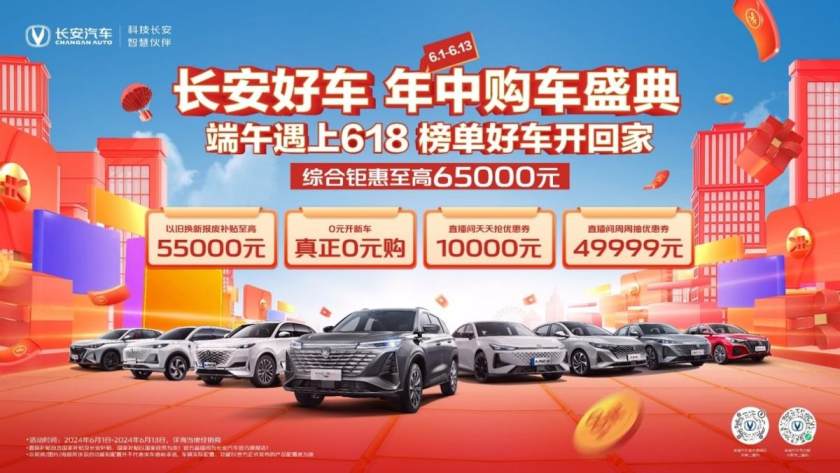 重庆车展期间,为回馈广大用户支持,长安汽车同步发起“长安好车 年中购车盛典”活动。6月13日前,用户下订包括第三代CS75PLUS冠军版、第二代UNI-V智电iDD、UNI-Z、逸动PLUS高能版、第三代CS55PLUS在内的车展热门车型,不仅可以享受超值劲爆价,更可获得至高55000元的以旧换新报废补贴、0元开新车等政策。同时长安汽车官方直播间还开启“天天抢优惠券10000元,周周抽优惠券49999元”福利放送。综合计算,部分车型综合钜惠甚至达到65000元,为用户打造买车、换车的超值好时机!
