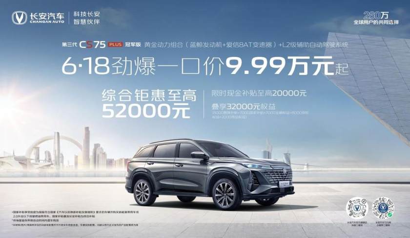 时值重庆车展,长安汽车也推出大量优惠购车政策,活动期间购买第三代CS75PLUS冠军版,可享受限时现金补贴20000元;并可叠享8000元置换补贴+7000元国家补贴+7000元金融权益+8000元保养权益+2000元用品权益,累计32000元的权益,综合至高钜惠52000元;此外,首任车主还可享0首付、0利息、60期超长贷款期限,以及享终身基础保养等政策,力度空前!