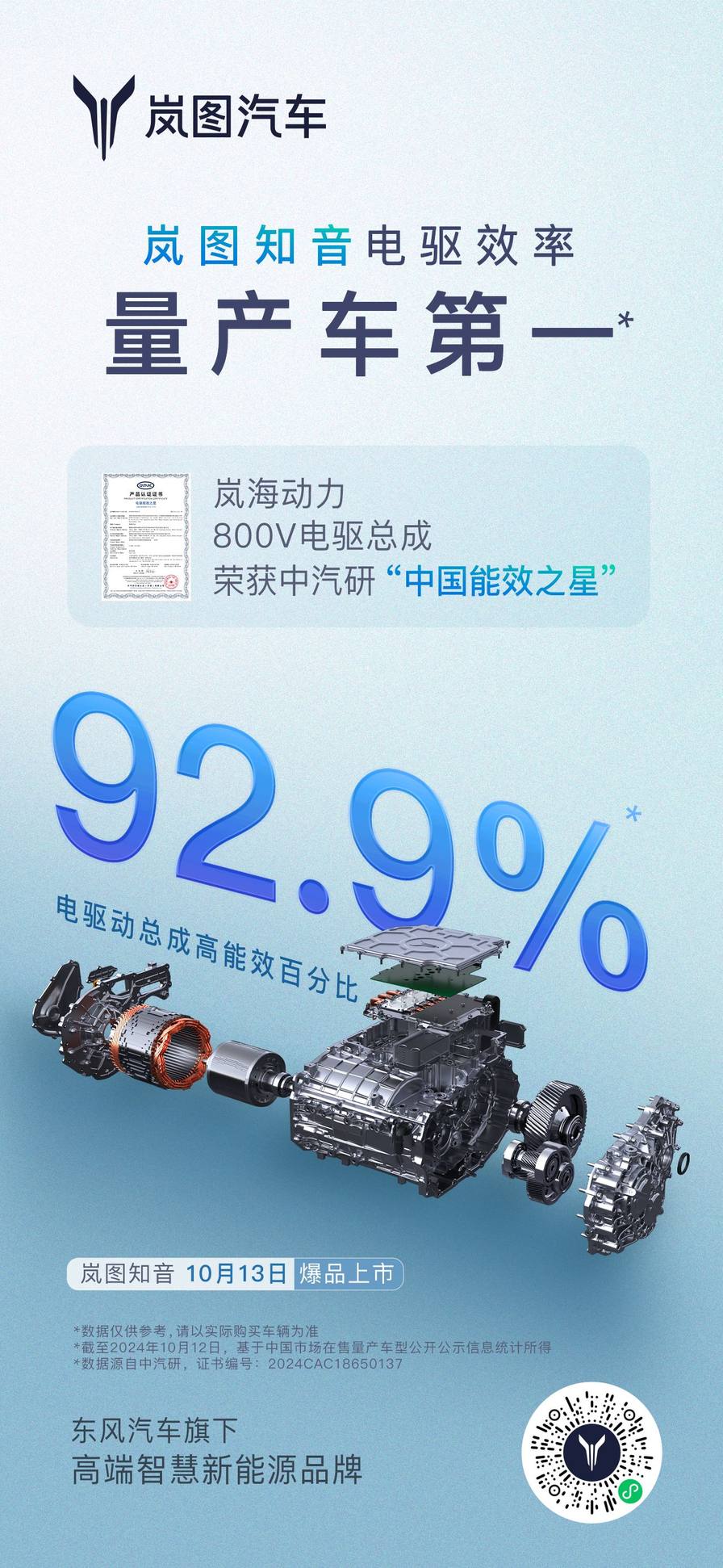 这一成就,意味着岚图知音在续航实力和用车成本都会有着绝佳表现。以92.9%的高能效百分比为例,相比其他车辆,在同样的电量下,岚海动力的车型能够行驶更远。