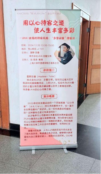 2024年12月20日下午,日本知名米其林星级餐厅UKAI集团旗下的高级主理人星野友香在上海大学举办了一场主题演讲。这次活动由龟甲万公司与上海大学联合主办,围绕日式服务的精髓与文化交流展开讨论,为在场师生带来了一场别开生面的文化体验。